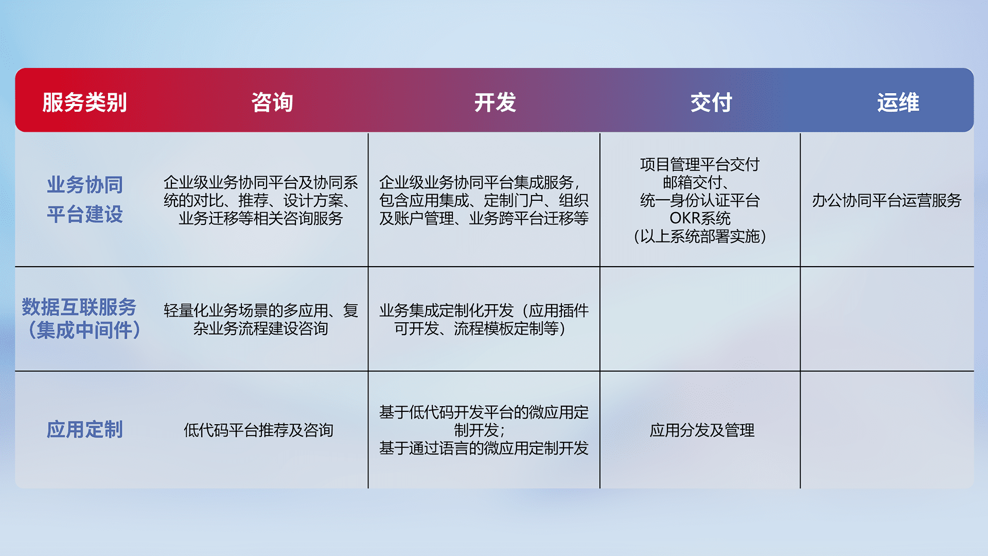 针对钉钉、、、企微、、IDaas等平台级产品提供产品的规划、、、、方案、、、交付、、、定制化开发等服务,,实现如统一协同办公、、、智能客户服务、、、、混合会议管理、、智能数据查询、、、等业务场景,,实现数字化转型。。